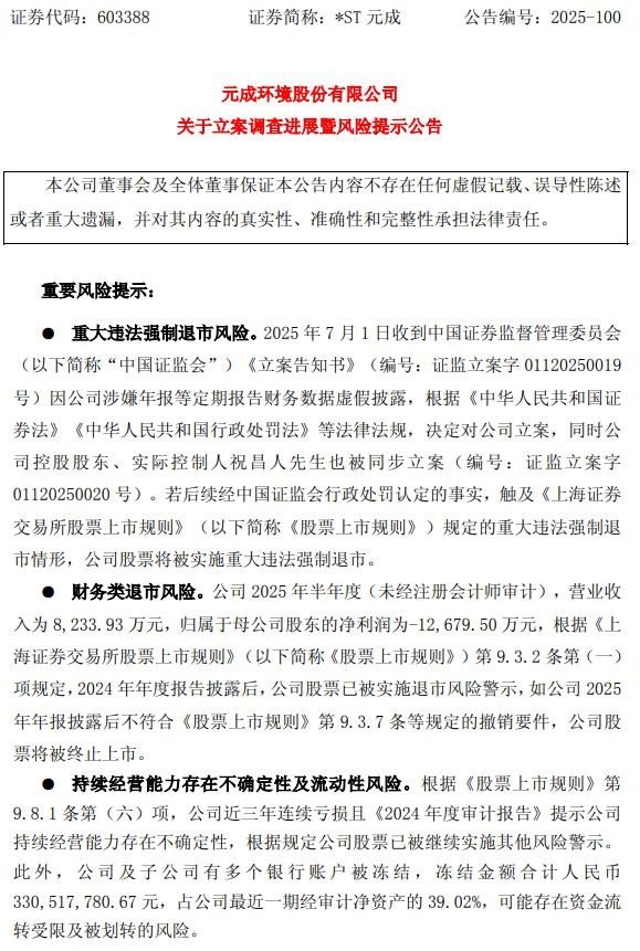 2025年9月10日,*ST元成(维权)(603388.SH)再次跌停,这是2025年9月8日以来公司股价连续第三个跌停,最新收盘价1.85元/股,再创年内新低。而就在此前的2025年9月2日,*ST元成发布《元成环境股份有限公司关于立案调查进展暨风险提示公告》,做出重要风险提示,包括: